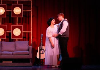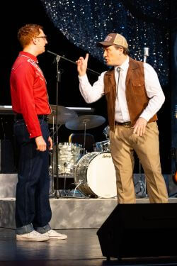 “Having recently shared the stage in Cincinnati Landmark Productions’ Million Dollar Quartet as rockabilly pioneer Carl Perkins, Keaton Eckhoff brings a deep familiarity with the sound and rhythms of the period to his turn as Buddy Holly here. Eckhoff captures both Buddy’s boyish charm and his steely resolve, pairing expressive vocals with a commanding stage presence. Evan Rogers, also a standout in that production with an electric performance as Jerry Lee Lewis, shines here as the “fourth Cricket,” Tommy Allsup, delivering an effortless performance that showcases his natural charisma and his ability to play the guitar like nobody’s business.