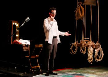 “The extended finale recreates the revue-style concert of Buddy’s last night onstage, at the Surf Ballroom in Clear Lake, Iowa. As Buddy and his tour mates, the Big Bopper (Craig Underwood) and Ritchie Valens (Ryan Reyes), prepare for the show, the backstage setting is evoked by a single prop – a rigging framework of ropes, pulleys, and sandbags. Credit scenic designer Kyle Dixon, a frequent Music Theatre returnee.